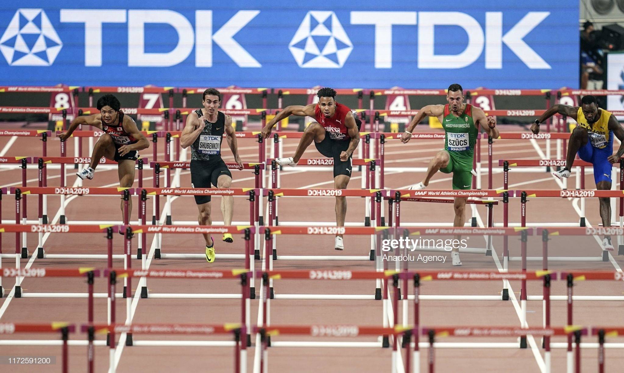 © DOHA, QATAR - SEPTEMBER 30: Russia's Sergey Shubenkov (2nd L), Japan's Taio Kanai (L), Switzerland's Jason Joseph (C) and Hungary's Valdo Szucs (2nd R) compete in the Men's 110 metres hurdles heats during day four of 17th IAAF World Athletics Championships Doha 2019 at Khalifa International Stadium on September 30, 2019 in Doha, Qatar. (Photo by Serhat Cagdas/Anadolu Agency via Getty Images)