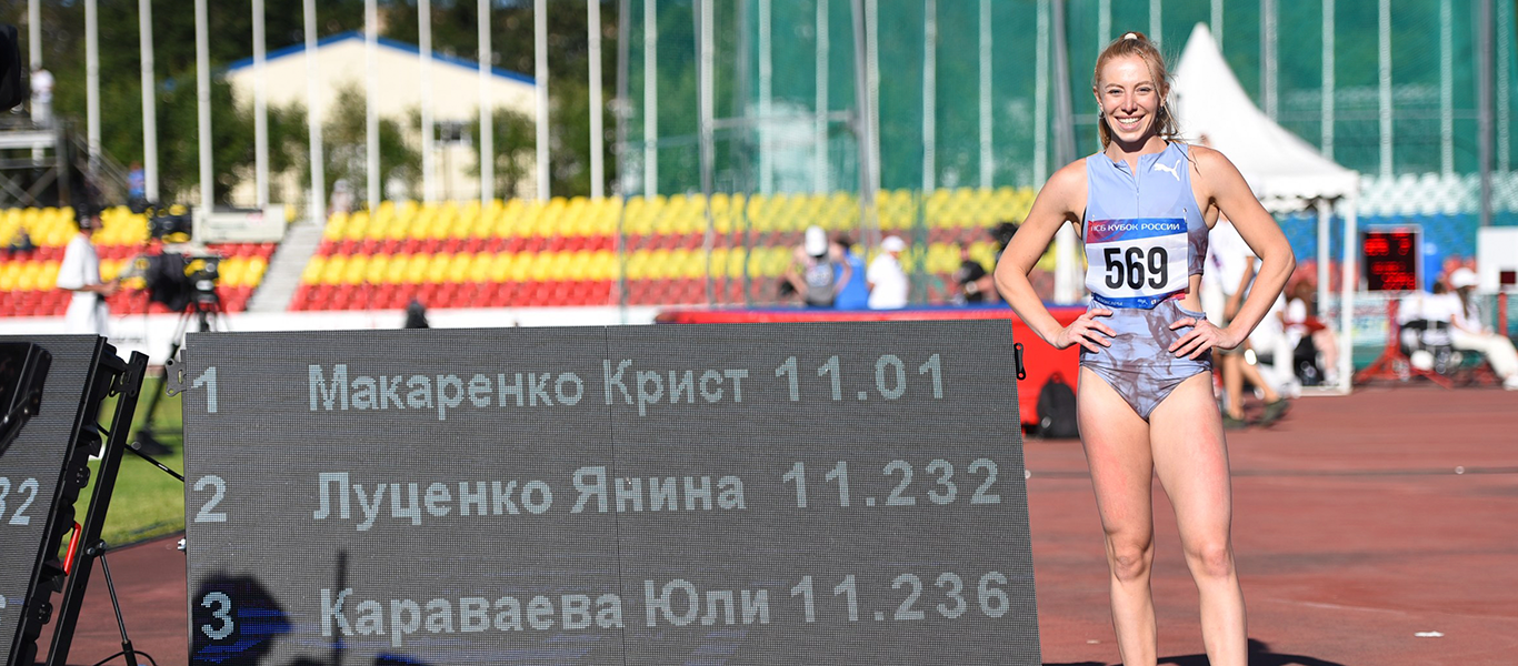 Потрясающий бег на дистанции 100 м провела Кристина Макаренко (Москва, Красноярский край), которая после недавнего поражения на соревнованиях в Брянске начала новую победную серию. Сначала Кристина установила лучший результат российского сезона в забеге – 11.19, а в финале обновила личный рекорд – 11.01 (+1.6 м/с). Второй в «Королеве спорта» стала Янина Луценко (Республика Беларусь) – 11.24. Юлия Караваева (Москва) показала такой же результат – 11.24, но по фотофинишу она третья в «Королеве» и вторая в ПСБ Кубке России. Бронзовая награда Кубка на радость местной публики у Виктории Максимовой (Чувашская, Нижегородская) – 11.48.