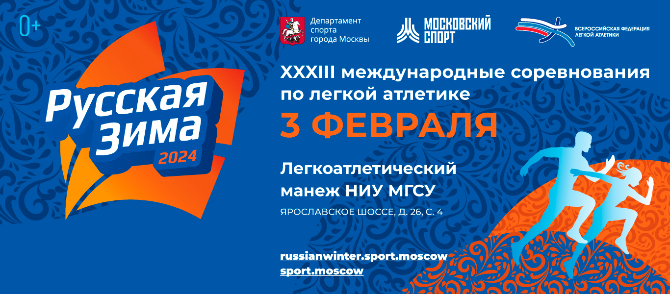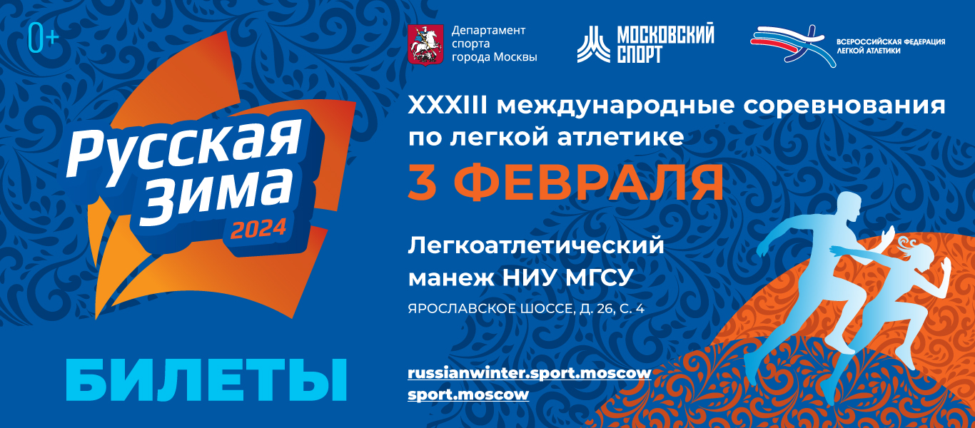 ХХХIII международные соревнования «Русская зима», которые пройдут 3 февраля 2024 года. Второй год подряд турнир примет легкоатлетический манеж НИУ МГСУ (Москва, Ярославское шоссе, д. 26, стр. 4).
