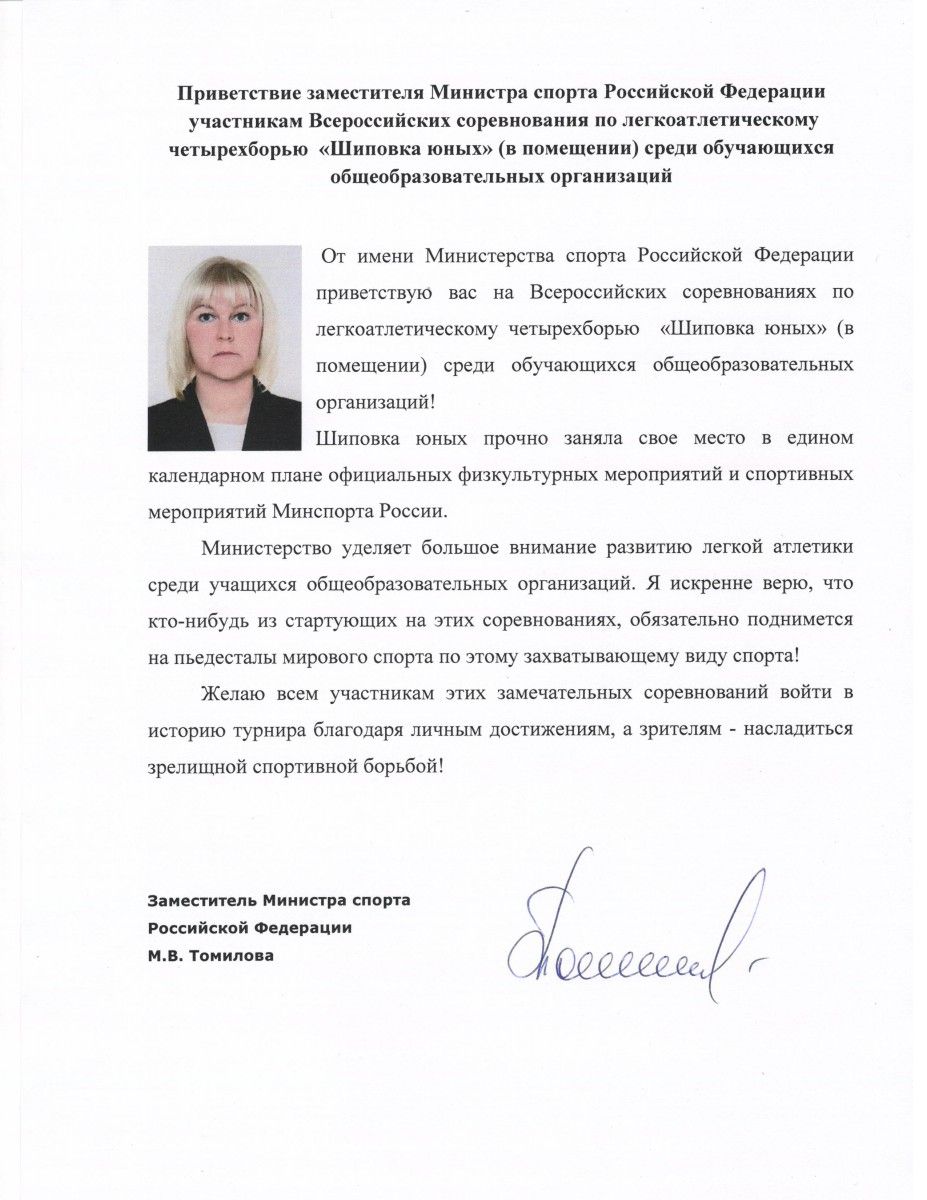 Приветствие заместителя Министра спорта РФ М.В. Томиловой
